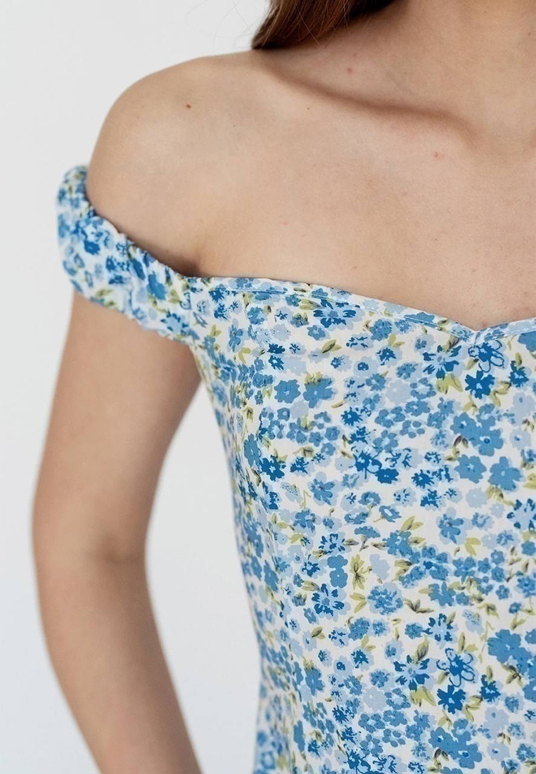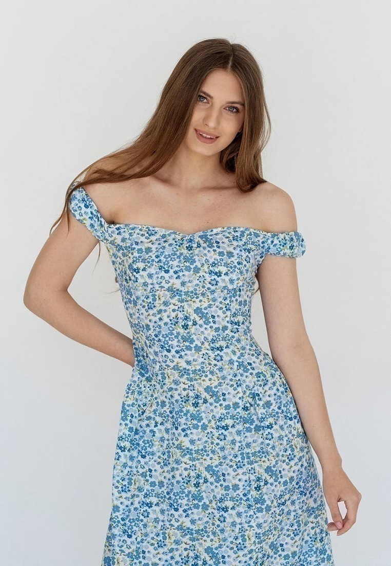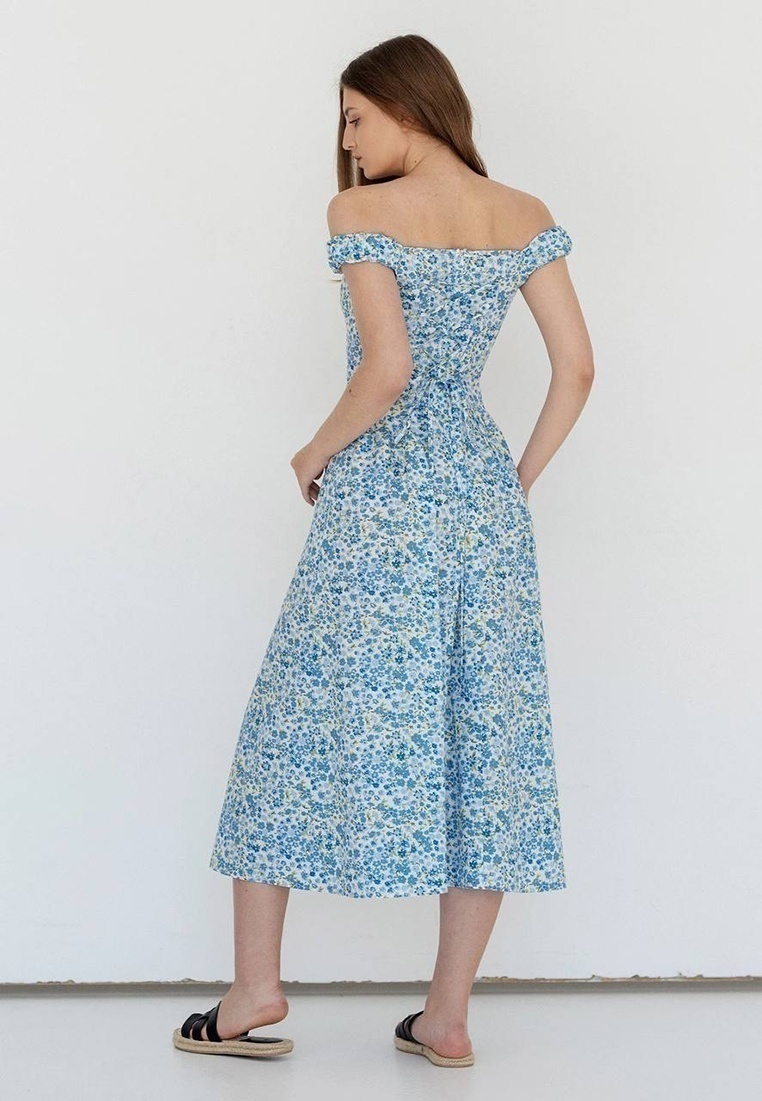 Cукня з коттону в блакитну квітку A lightweight cotton dress in a floral print. This feminine model design features off-the-shoulder wide strap-sleeves with elastic, and beautifully accentuating the bustier. It has a hidden closure and is crafted in a midi length from soft, cozy cotton without a lining.