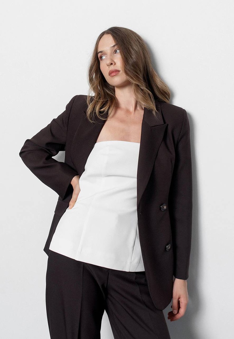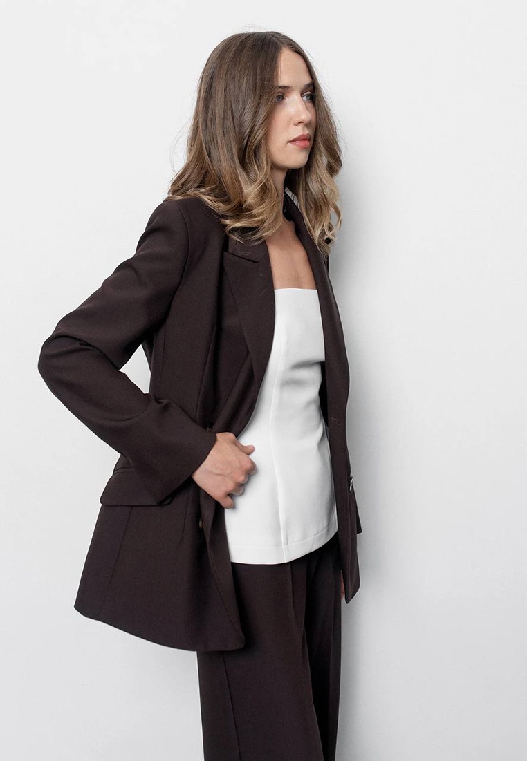 Приталений жакет шоколадного кольору The fitted jacket with a double-breasted closure is made of comfortable, lined suit fabric.
