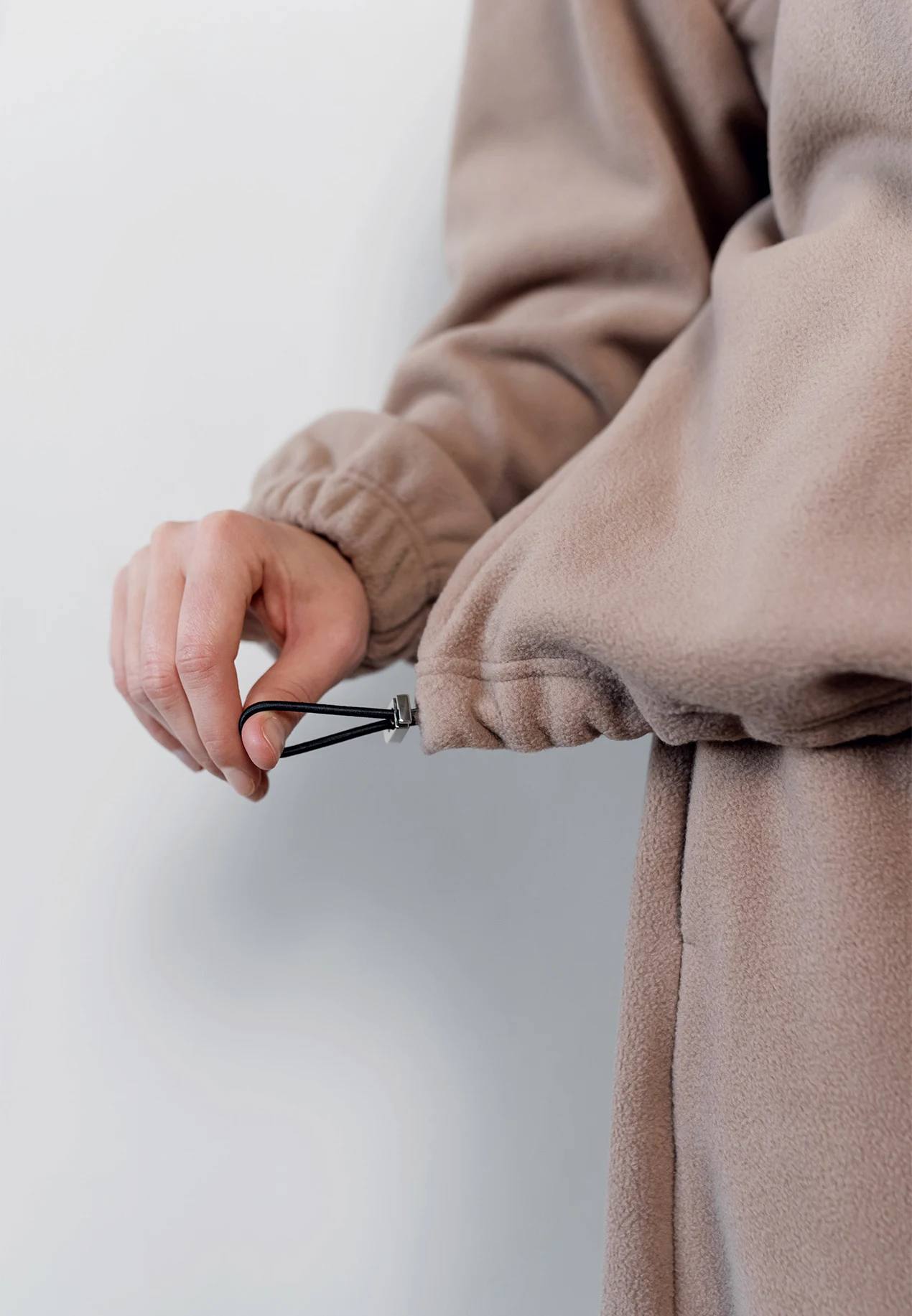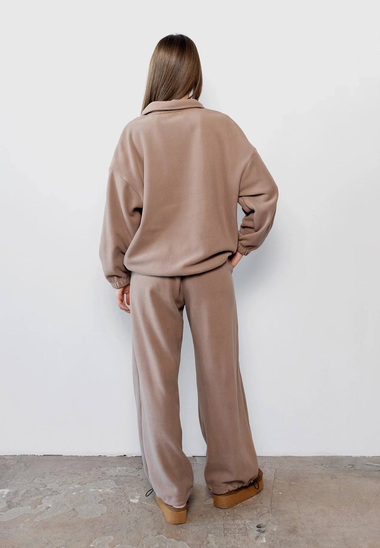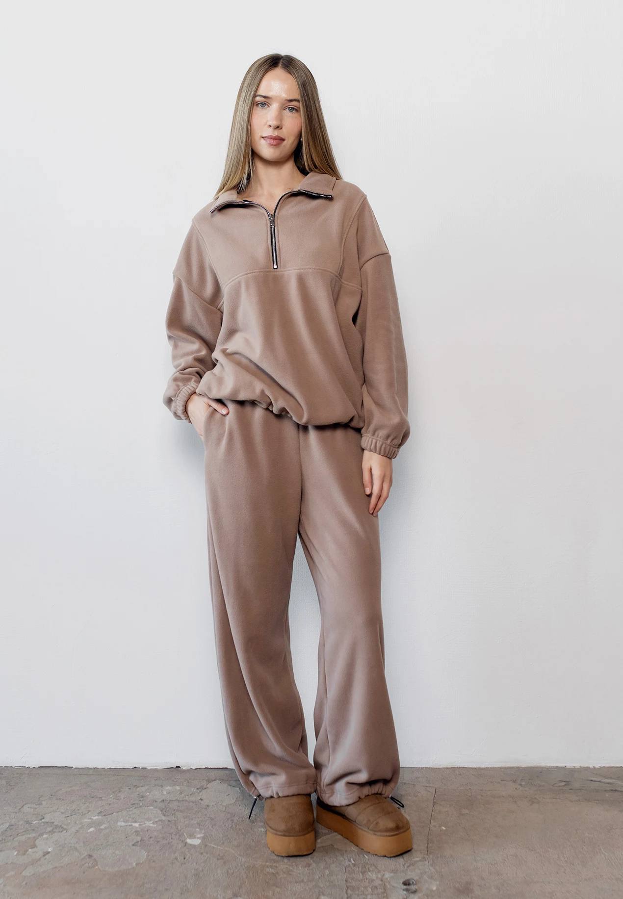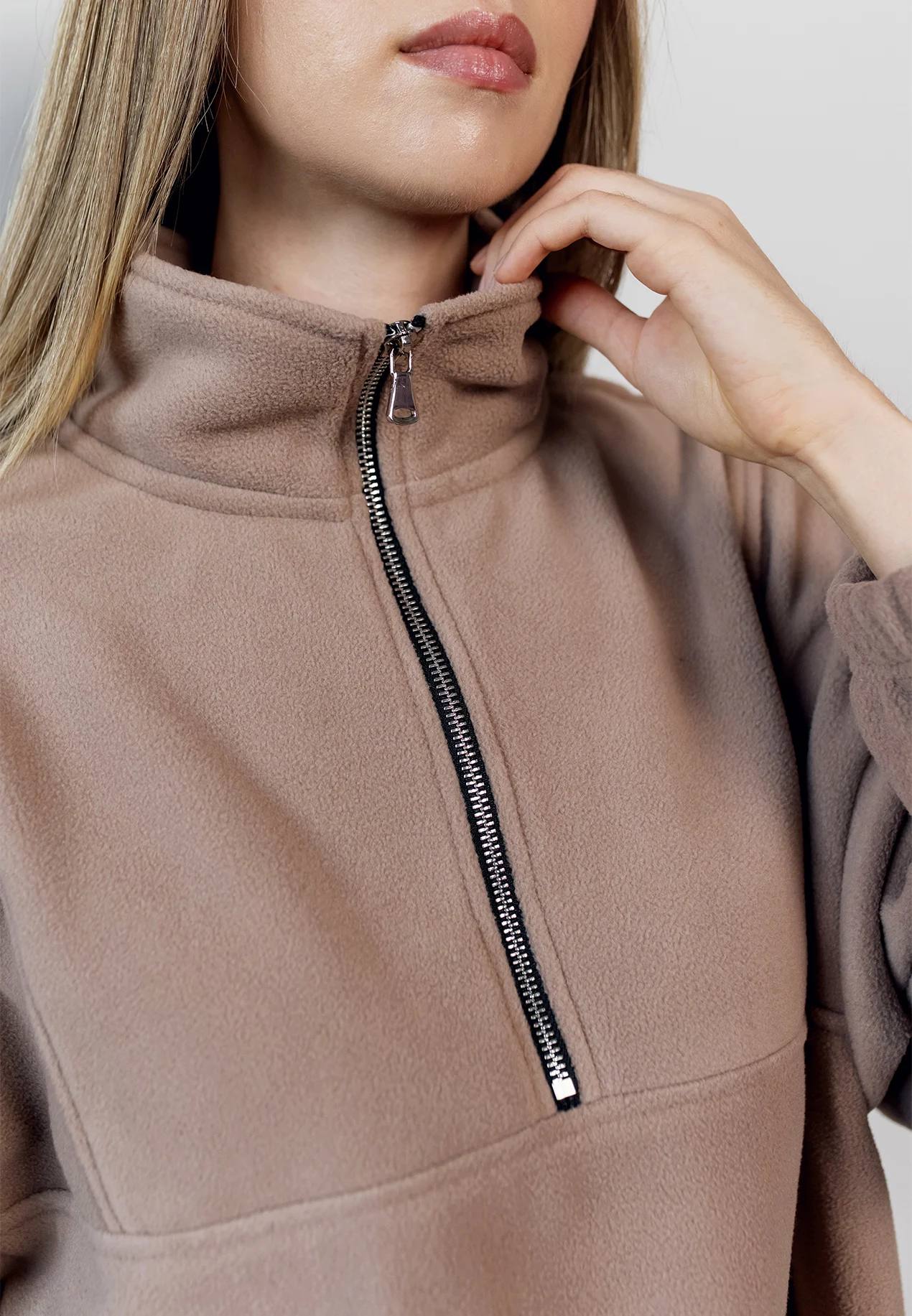 Cвітшот з флісу кольору мокко A warm, casual sweatshirt with a loose fit is made from fleece fabric. The sports sweater model is created without lining, with a zippered collar and elastic at the bottom and sleeves.