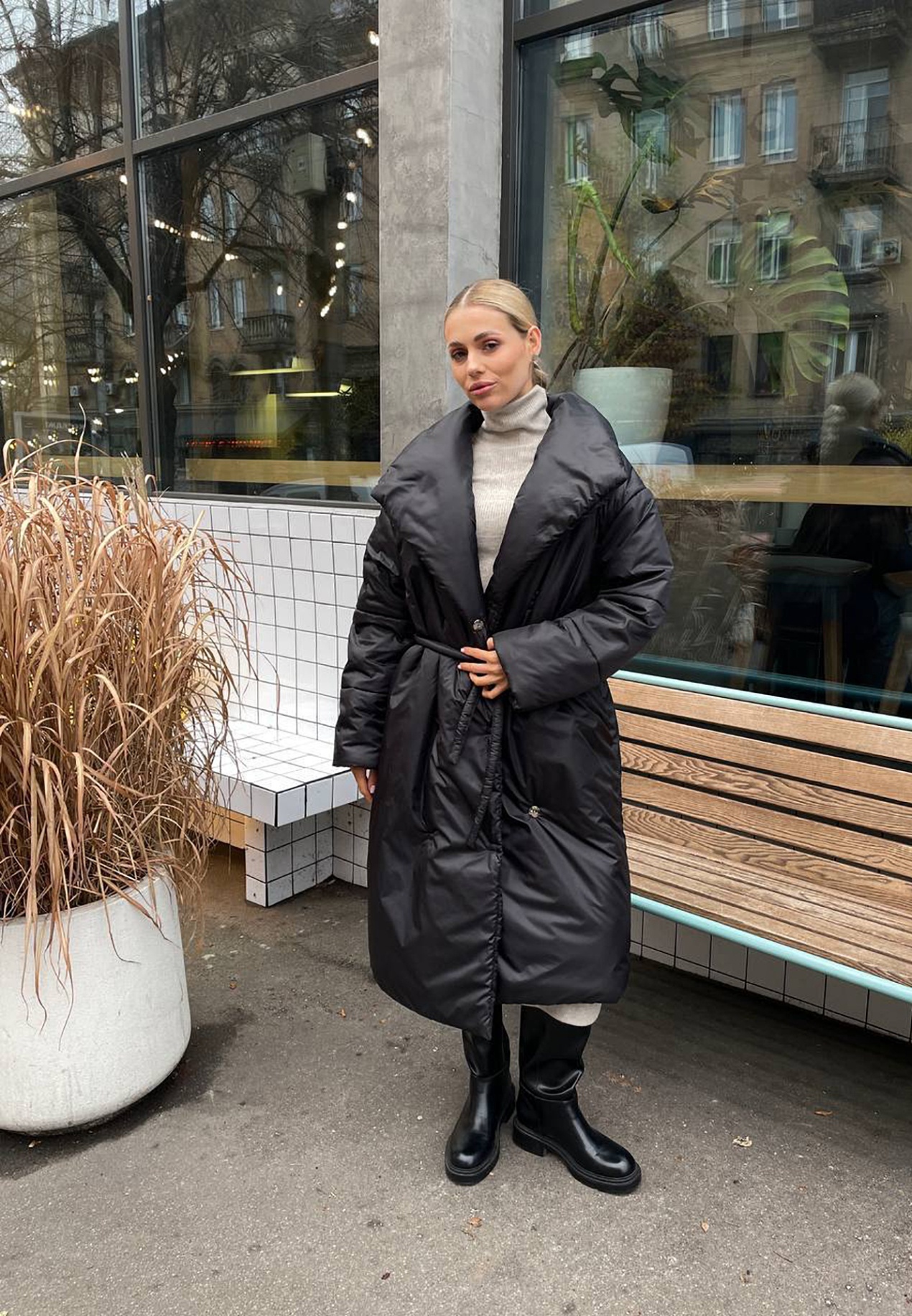 Cozy bulk blanket-jacket in a free cut is crafted with snaps-fasteners, and is made in the most comfortable length. Comes with an elastic belt. This warm model of a lapel-coat is created from matte rainwear lined fabric, with insulation.
