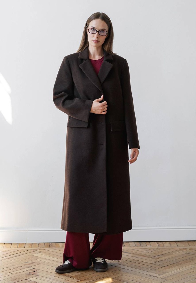 Maxi coat in chocolate color An elegant coat in a modern style is made from patterned fabric with a lining, in the format of an ultra-fashionable maxi model of a single-breasted jacket. A comfortable coat-jacket, with a straight cut, effectively emphasizes the silhouette and keeps its shape. Features a classic fastening.
