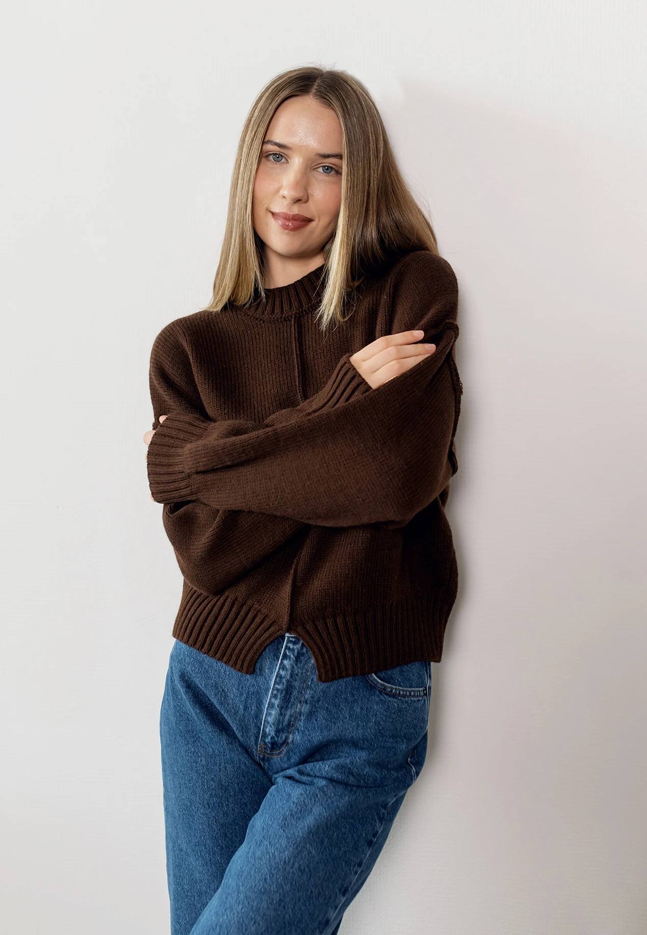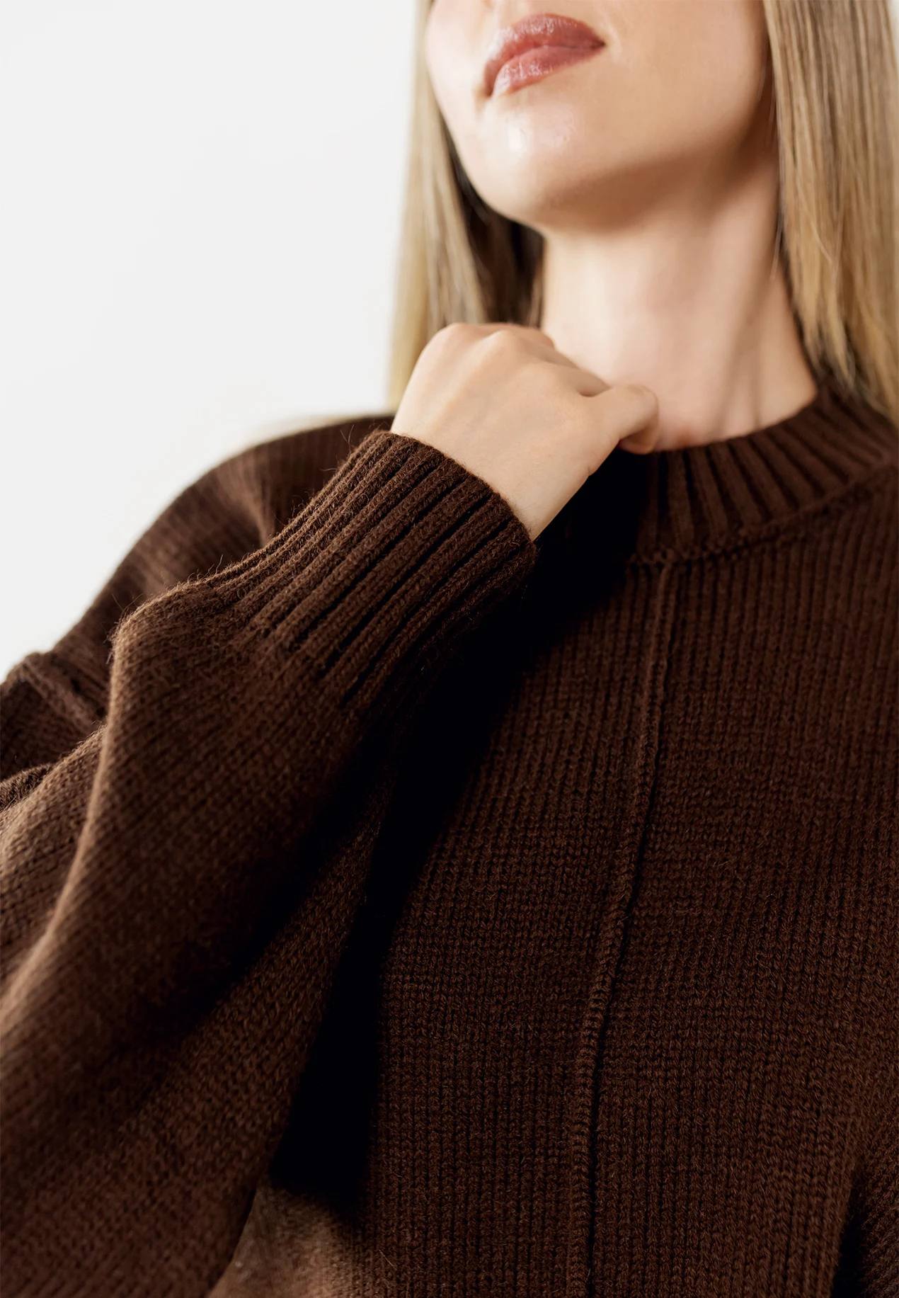 Cutout sweater in brown color A cropped knitted sweater with a round narrow neckline and a stylish decorated cutout at the front. This wool jumper is made with voluminous cuffed sleeves.
