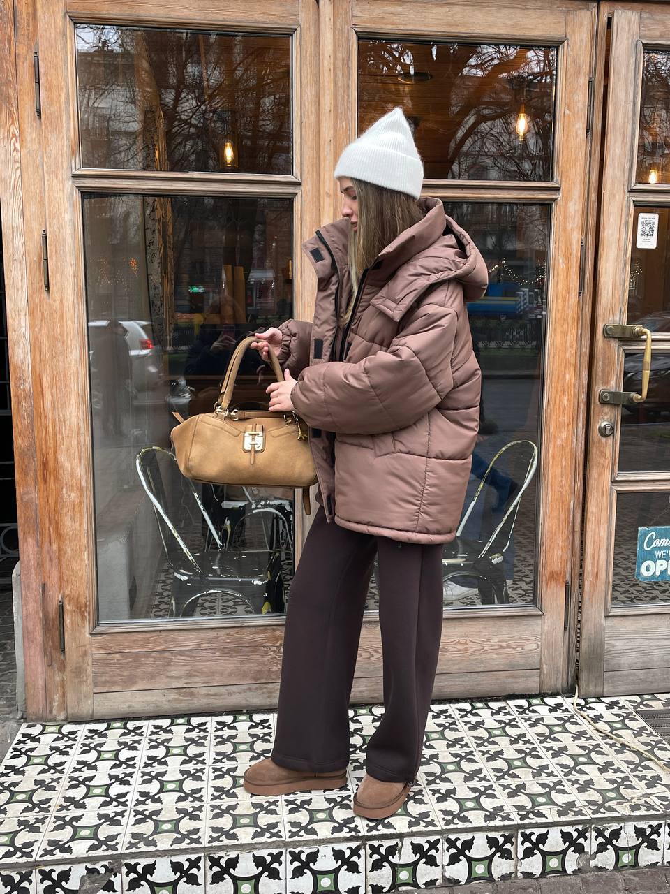 Brown bulk quilted jacket An ultra-fashionable quilted bulk jacket is crafted from high-quality rainwear fabric with nonwoven batting paddings down lining. This reliably insulated, modern model has a detachable hood, volume adjustment at the bottom, and comfortable sleeves with elastic. Convenient functional pockets are located on the front. The warm jacket fastens with velcros and a zipper.