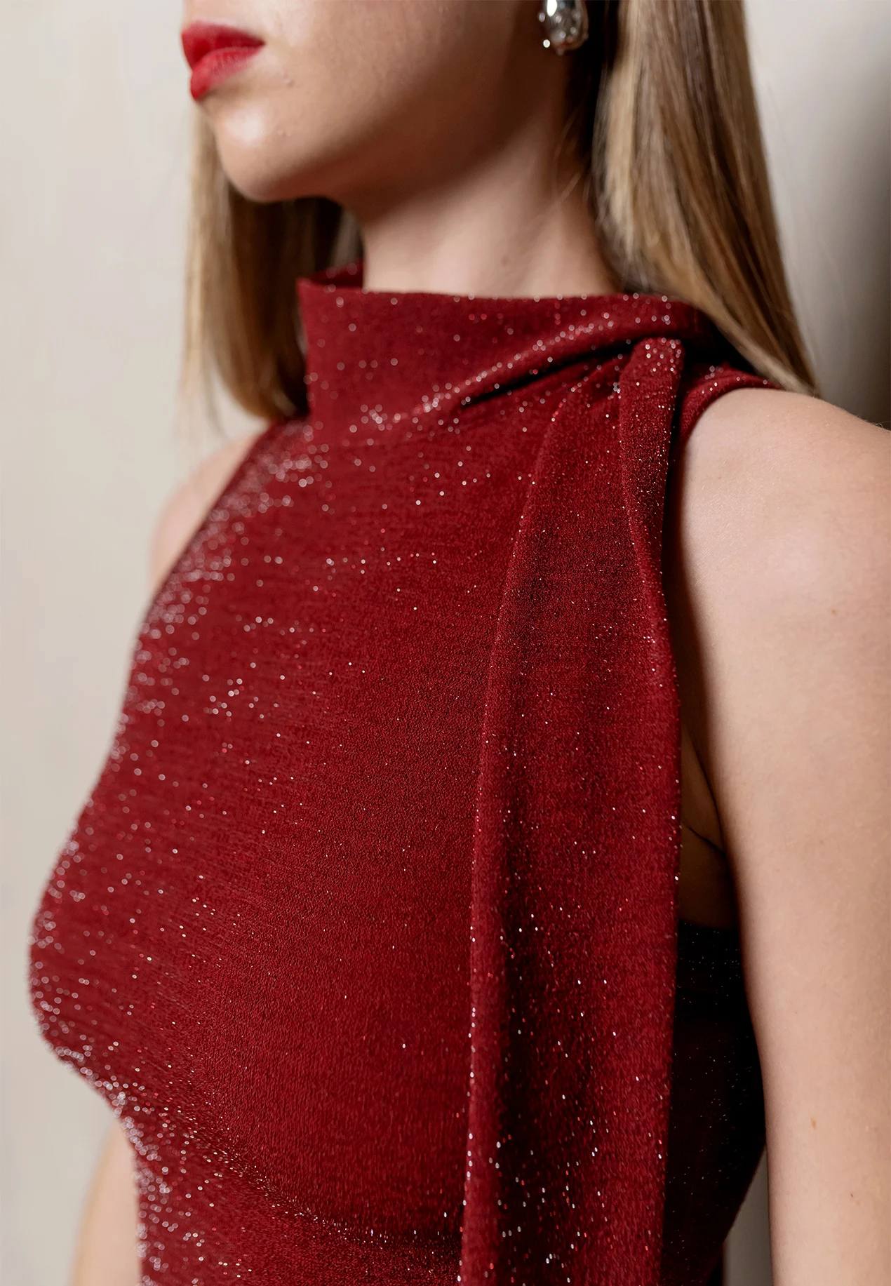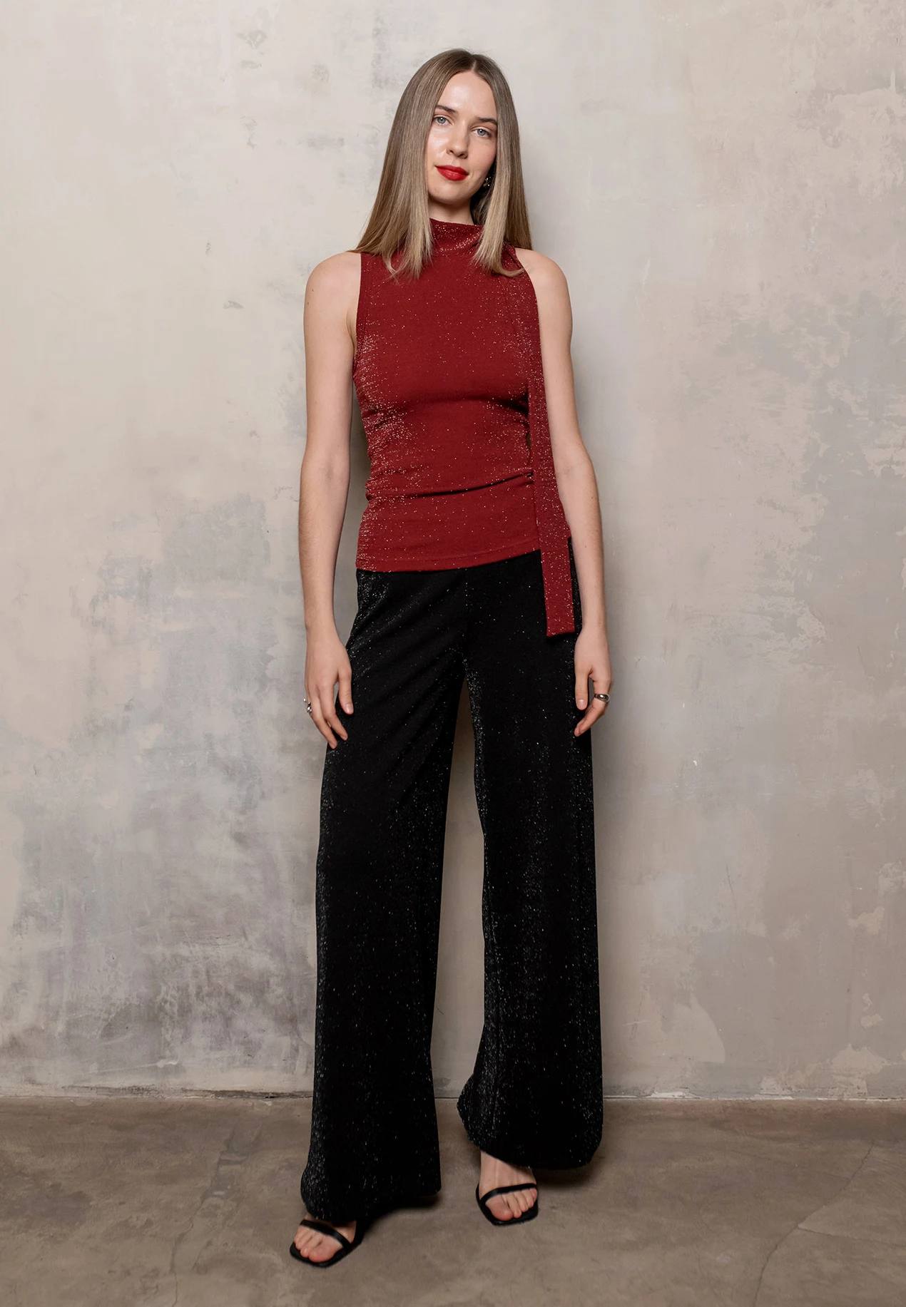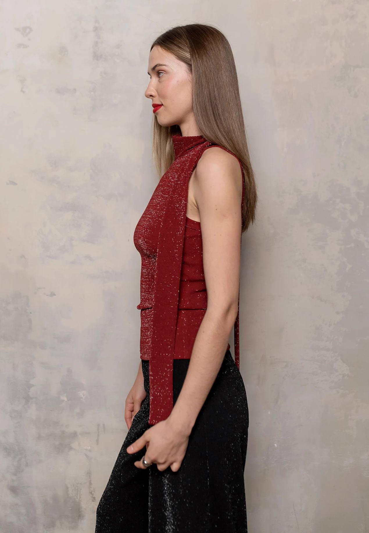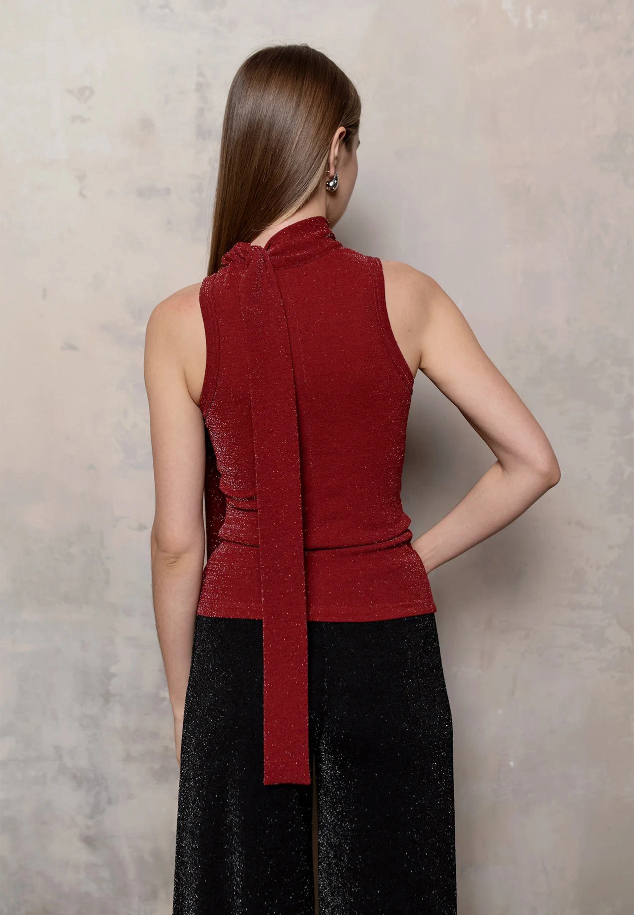 Red tied lurex top Stylish top with a wide tie is crafted from high-quality, spicy fabric with lurex. Sleeveless model in a tight-fitting cut charmingly emphasizing feminine shapes.