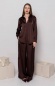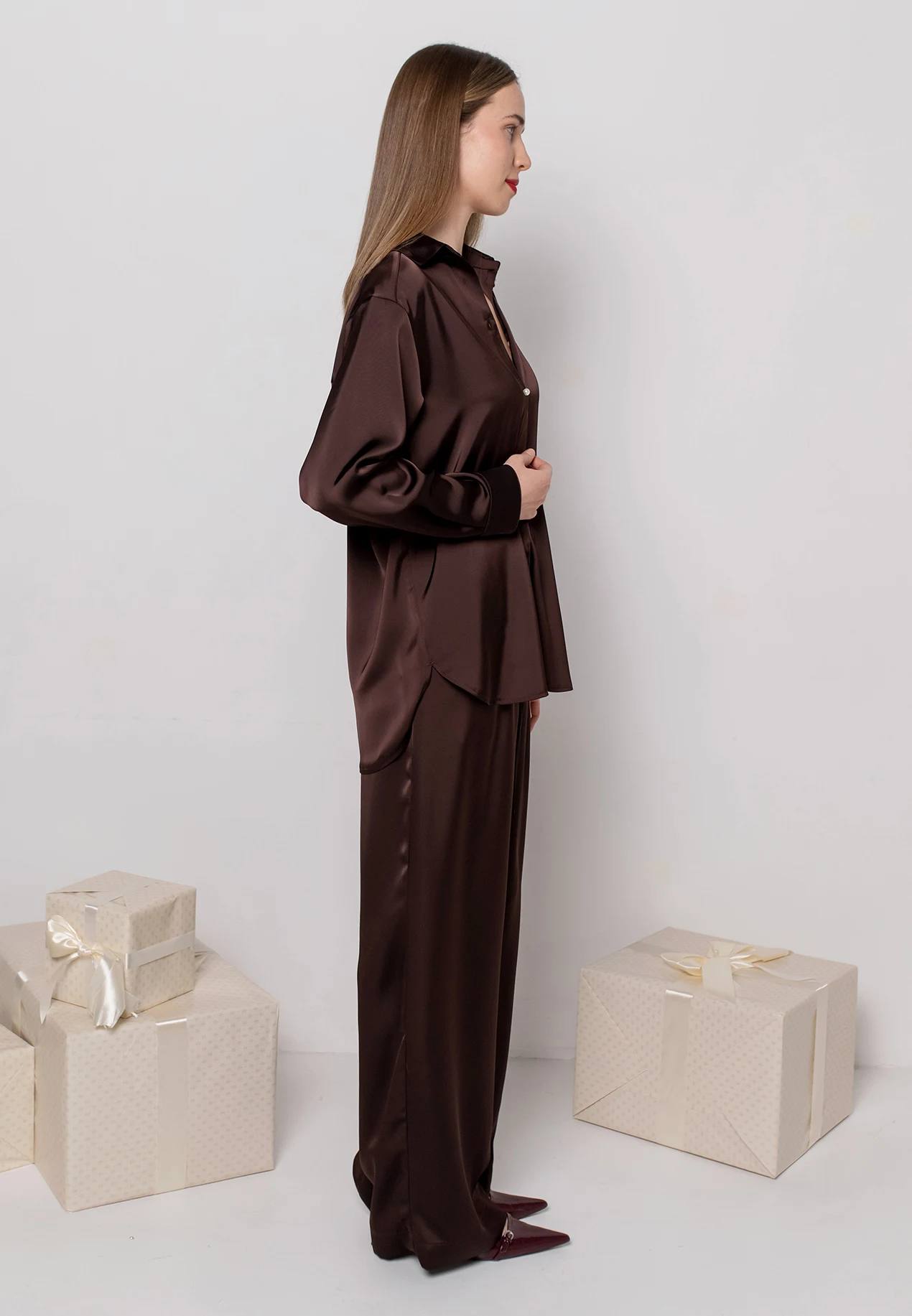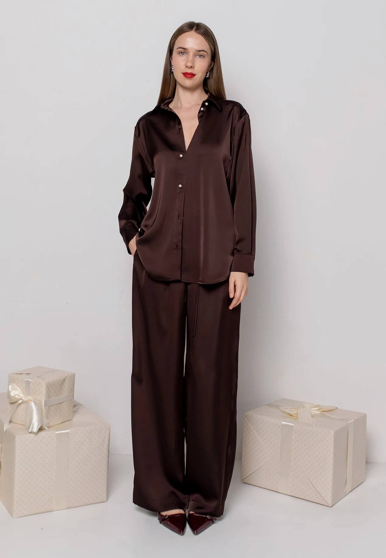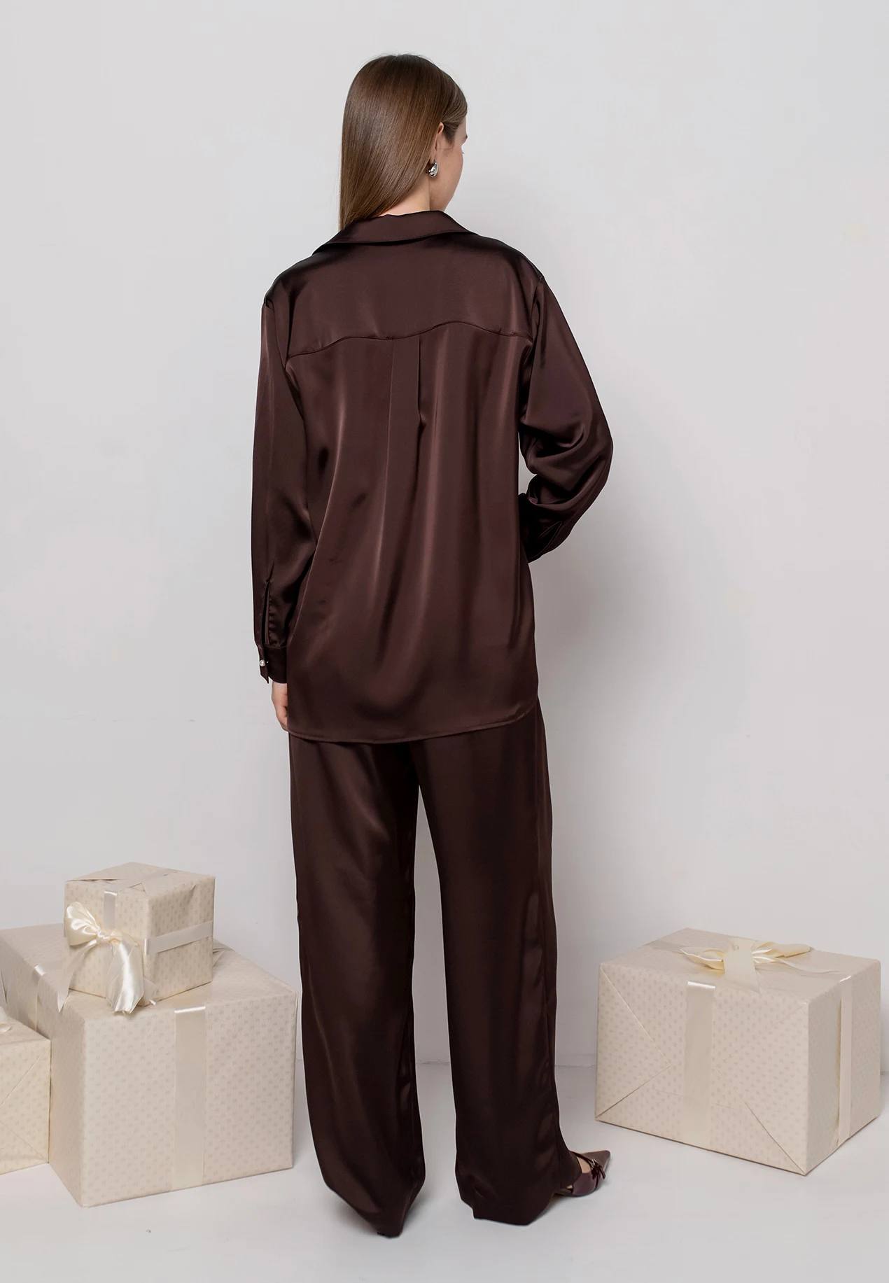 Satin shirt in chocolate color The impeccable trendy shirt is made from thin silk satin without lining, which comfortably and plastically fits the figure. The elegant evening model of the blouse is smooth and pleasant to the touch, has a classic collar, comfortable cuffs and button fastenings.